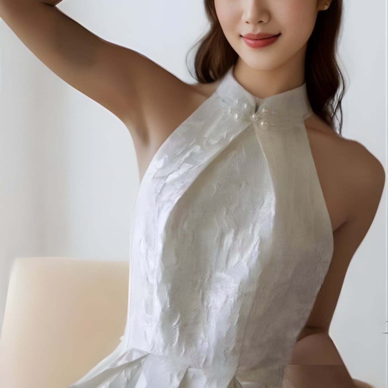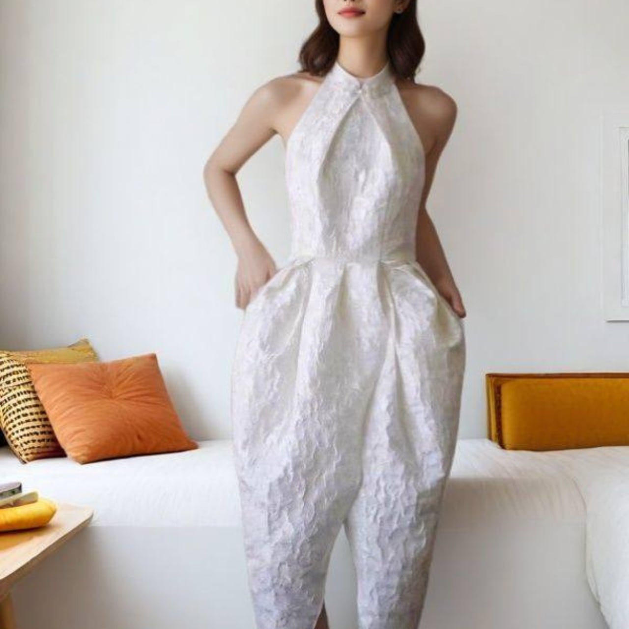 ホルターネックのデザインがデコルテを美しく引き立て、