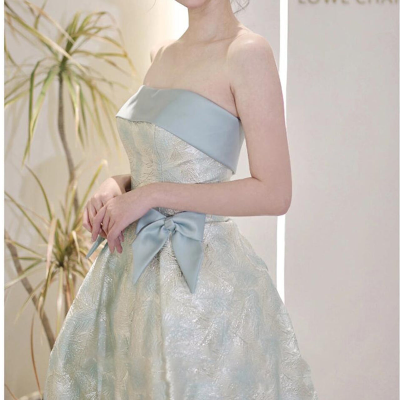 フラワージャカード ベアトップロングドレス(ブルー) a450
