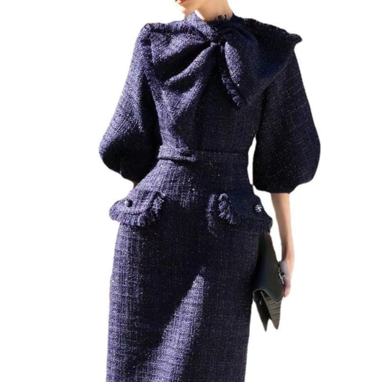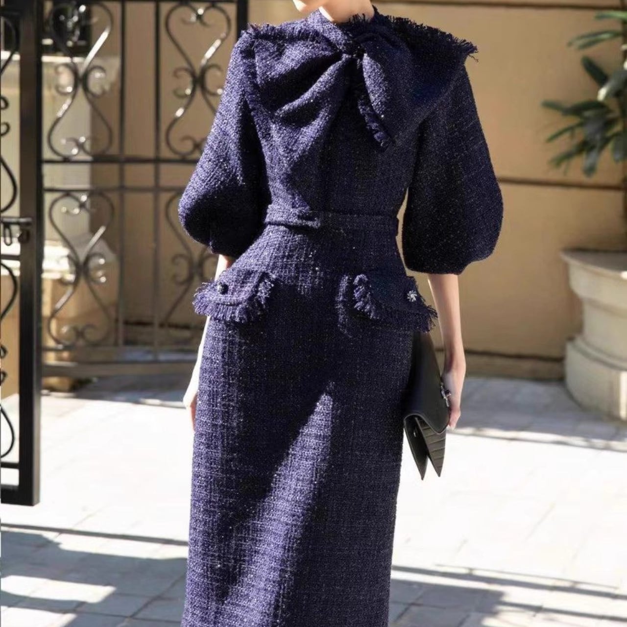 上質感のあるツイード素材に、印象を引き締めるボウデザインをあしらったロングワンピース。