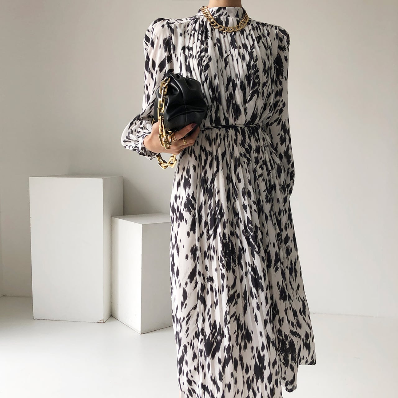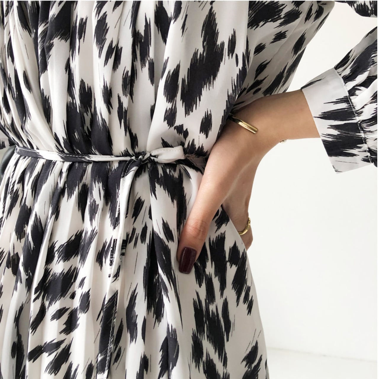 動くたびに揺れる軽やかなシルエットと、モノトーンのニュアンス柄が甘さを抑え、大人の洗練された印象に仕上げてくれます。