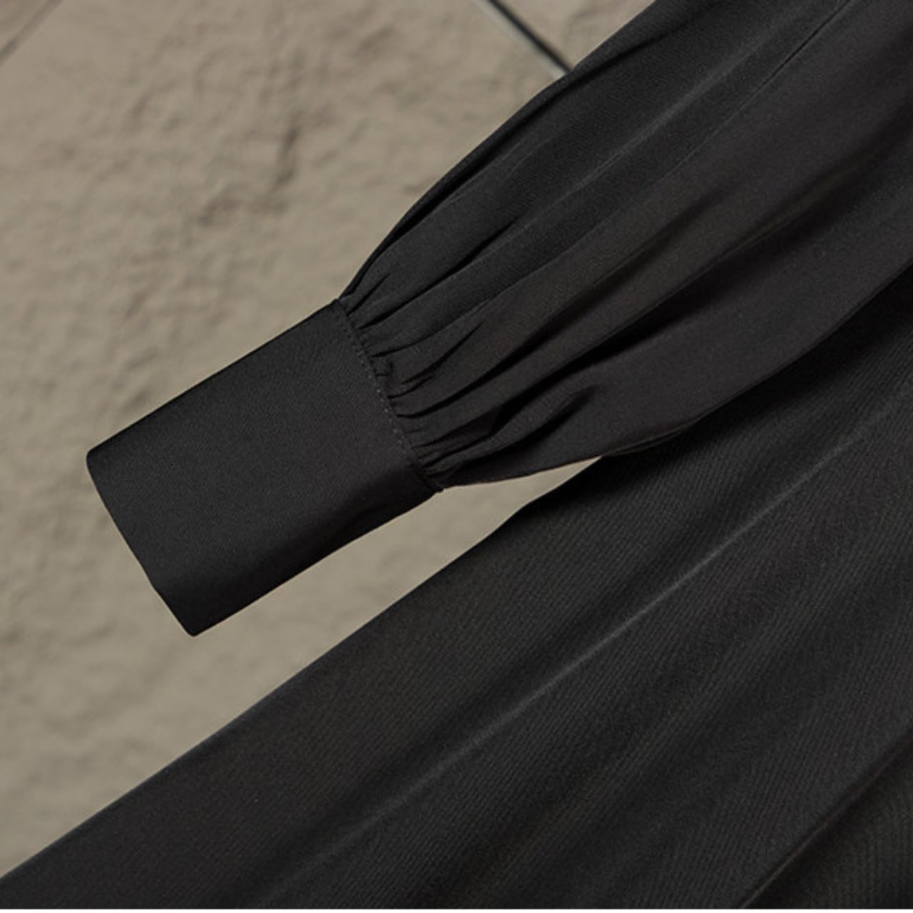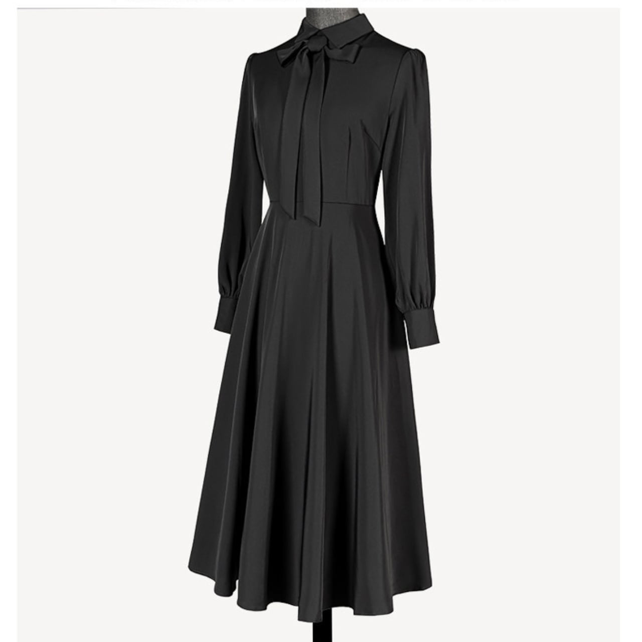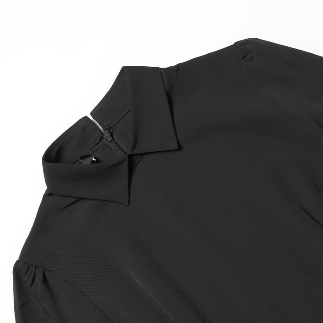 顔まわりをすっきり見せるシャツカラーに、優雅に揺れるフレアライン。