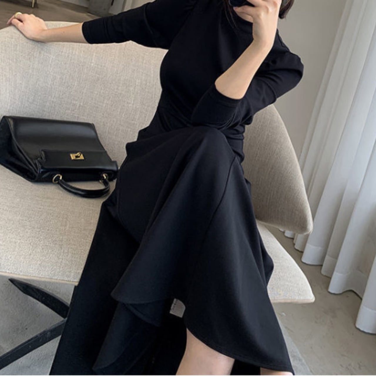 YOUNEEらしい上品なブラックワンピースです。