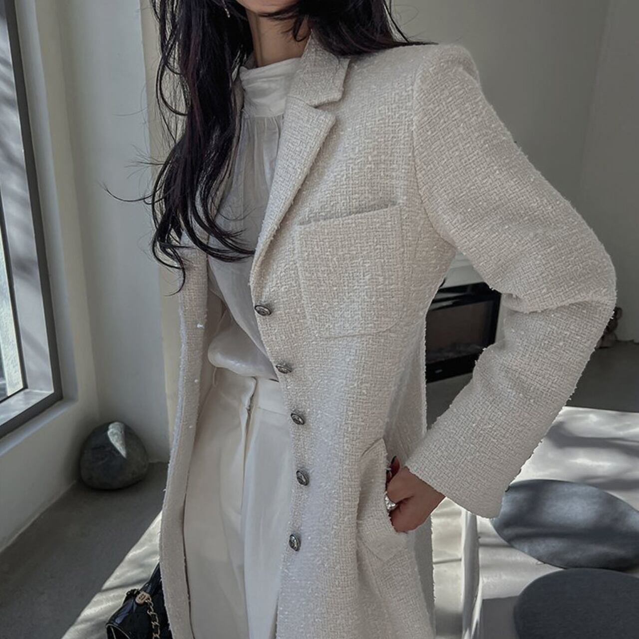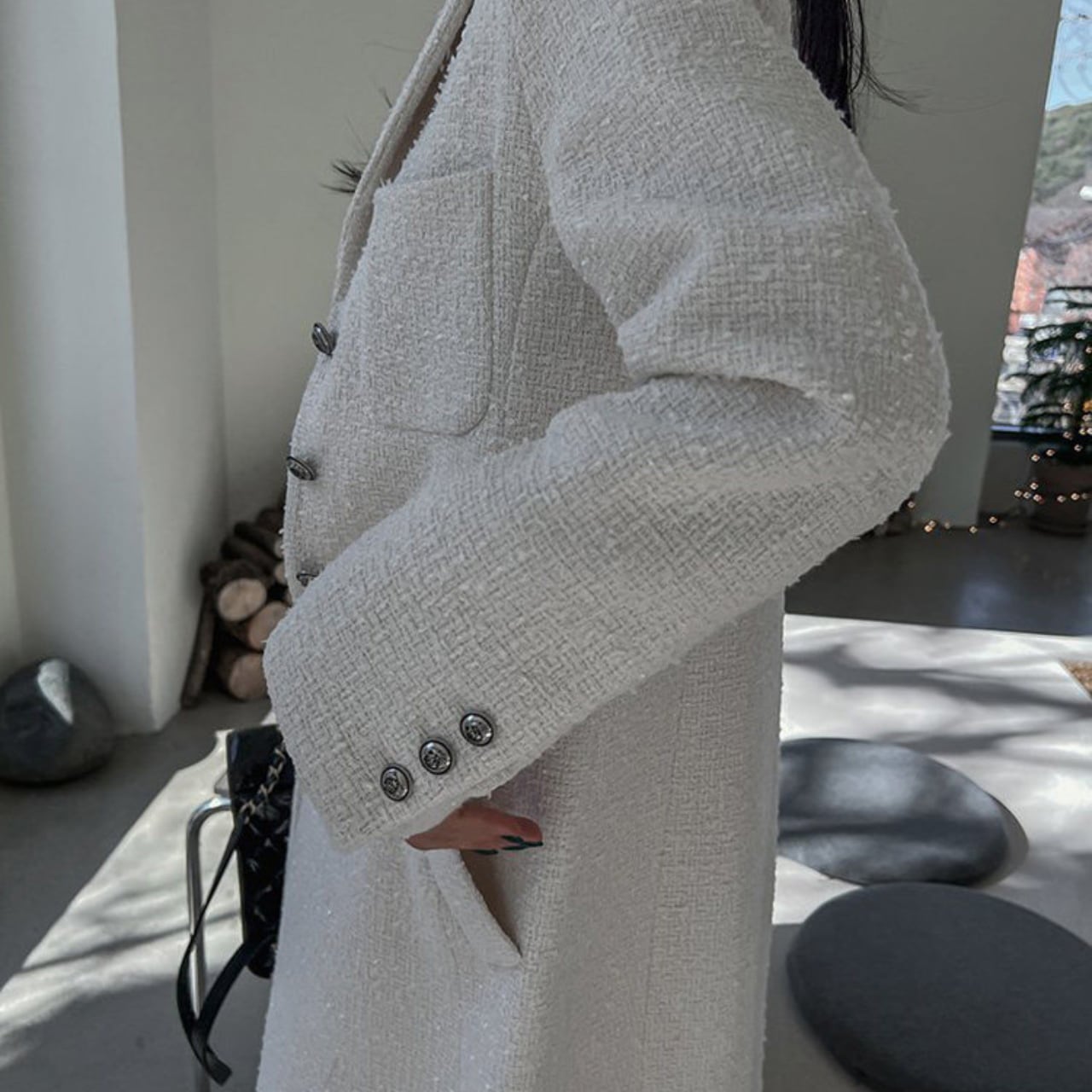 光を柔らかく受け止めるツイード素材が、
