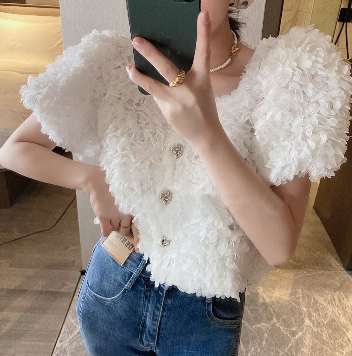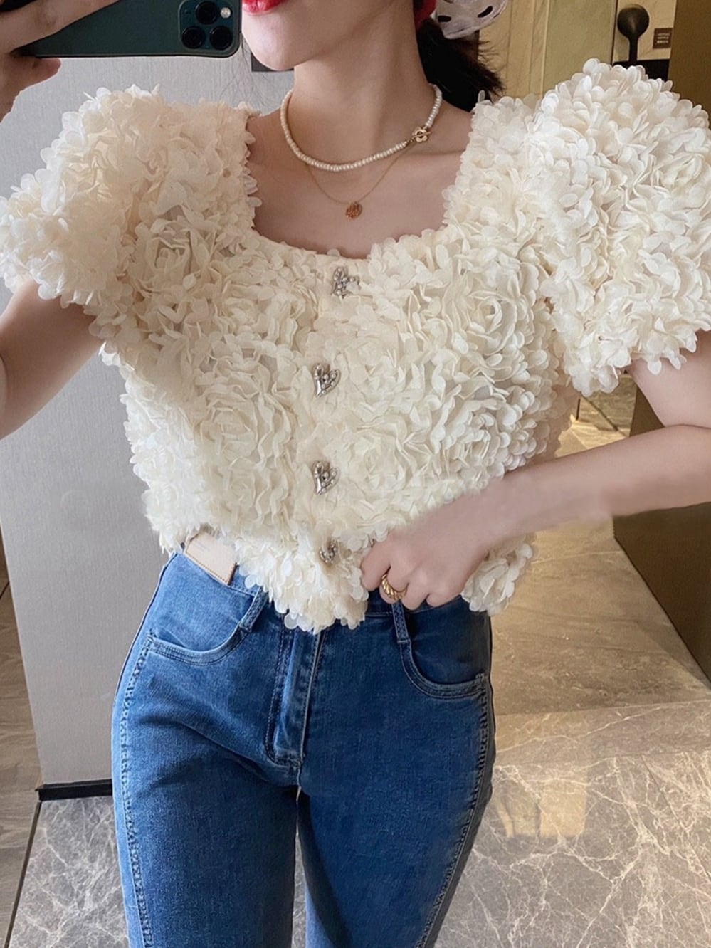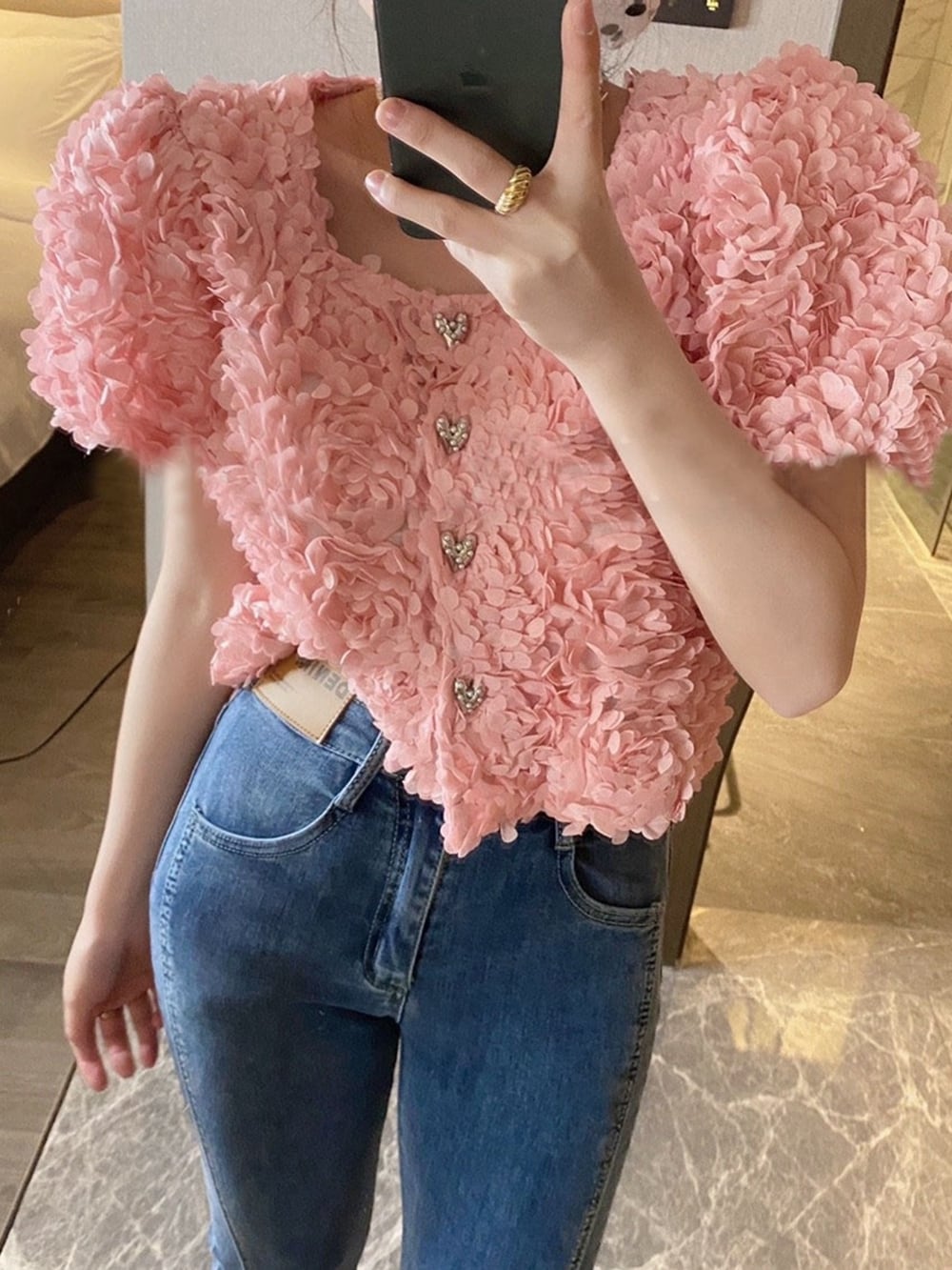 ・新たに登場したハート ラインストーン ボタン パフスリーブ トップス